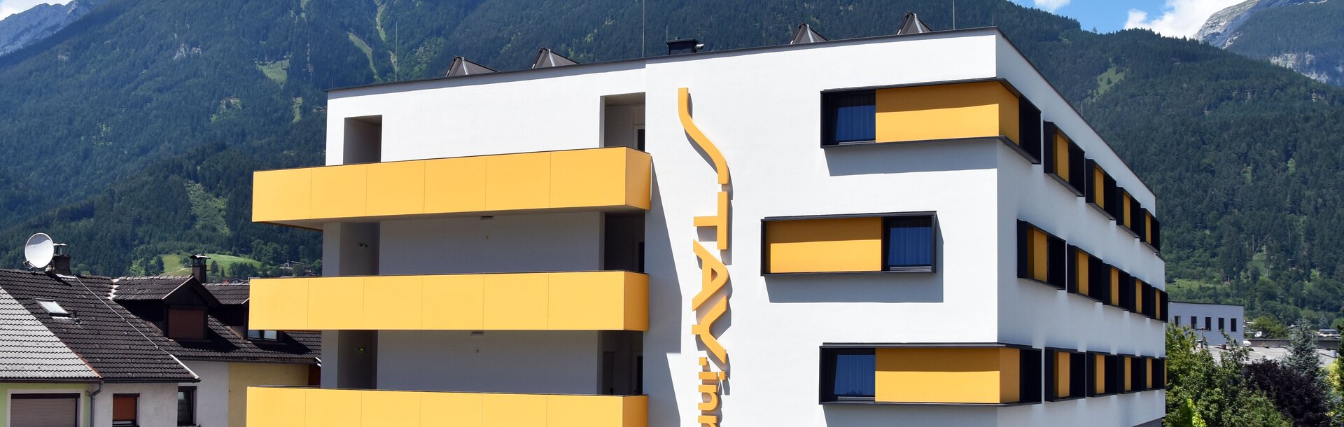 Wer hier her kommt, bleibt gerne. Oder kommt wieder. Seit exakt acht Jahren bietet das STAY.Inn-Hotel allen, die nach Schwaz kommen, eine Bleibe auf Zeit. Mit modernem Design, stilvoller Ausstattung und einzigartigem Service samt 24-h-Check-In punktet das Hotel bei Geschäftsreisenden und Touristen gleichermaßen. Kräftige und helle Farben in eleganter Kombination vermitteln einen freundlichen, einladenden Eindruck – gleich auf den ersten Blick: Denn die hellgraue Fassade mit den leuchtend gelben Balkonen, der farbgleichen Aufschrift und den passenden Fensterläden macht das schlichte, kubische Gebäude zu einem echten Hingucker.