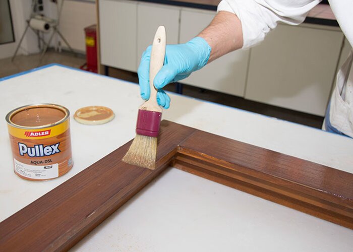 Dann mit der Dickschichtlasur Pullex Aqua-DSL dreimal lackieren, um die vorgegebene Trockenschichtstärke von 80 μ zu erreichen – und fertig ist das „neue“ Fenster!