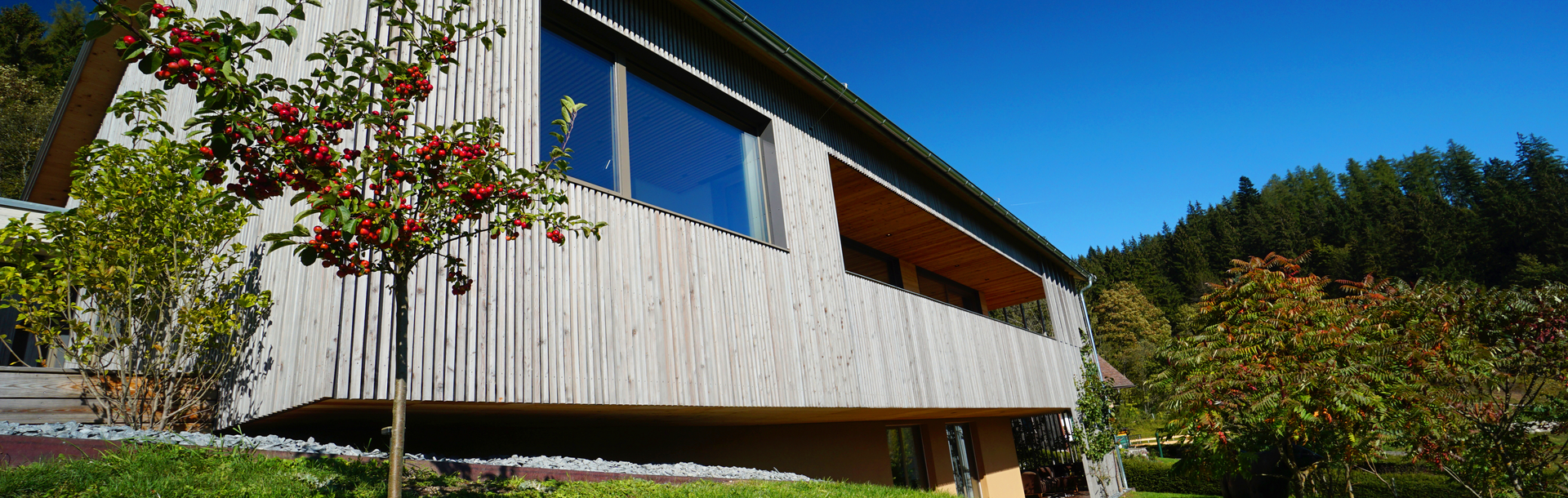 Pullex Silverwood di ADLER, che mantiene stabile la colorazione anche in situazioni di forte irraggiamento solare. Anche le cornici delle finestre in legno alluminio della ditta Josko sono grigie e verniciate con un protettivo per legno A