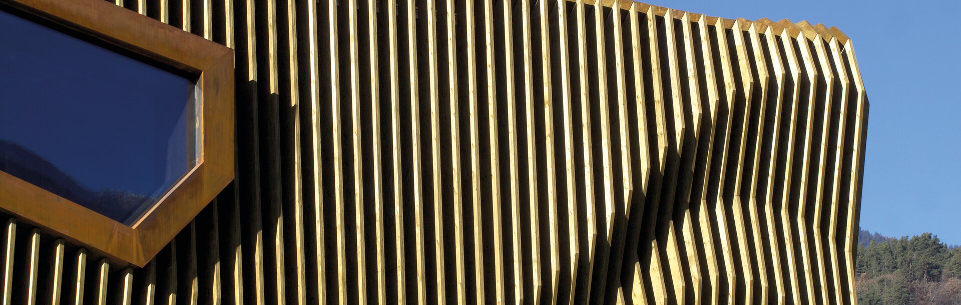 Gli unici tre elementi che interrompono le linee omogenee del "monolite in legno" sono costruiti in acciaio COR-TEN - arrugginito in superficie ma resistente alle intemperie: la bussola d'ingresso e le due ampie finestre al terzo piano, simbolicamente rivolte verso i boschi circostanti in una sorta di dialogo con l'origine della materia prima che costituisce l´edificio stesso. Dietro le onde della facciata si nasconde una struttura di elementi poligonali che ricordano le cellette di un alveare. Tali strutture sono un'ulteriore dimostrazione di quanto il legno sia un materiale altamente flessibile e plasmabile. Una realizzazione come la sede LignoAlp rappresenta al meglio la forza e il valore del legno come materiale vivo, duttile e resistente.