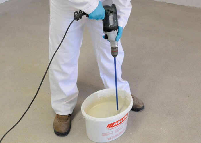 Per ridurre la capacità di assorbimento del pavimento in calcestruzzo, diluite Aviva Tiefengrund con acqua in rapporto 1:1 e applicarlo con una spazzola per pavimenti. Lasciare asciugare il fondo per 5 ore in modo che il pavimento possa assorbire bene il liquido e non lasci uno strato lucido.
